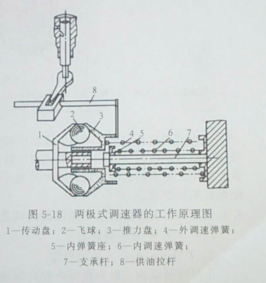 這時(shí),由于內(nèi)彈簧預(yù)緊力大而剛性強(qiáng),因此即使轉(zhuǎn)速繼續(xù)升高,飛球的離心力仍不足以推動(dòng)內(nèi)彈簧座移動(dòng)。但此時(shí)如由于外界負(fù)荷變化使轉(zhuǎn)速低于n時(shí),外調(diào)速?gòu)椈杉纯赏苿?dòng)供油拉桿左移增加供油量,以保持發(fā)電機(jī)組可在nd轉(zhuǎn)速下穩(wěn)定工作。nd即為低空轉(zhuǎn)轉(zhuǎn)速。當(dāng)發(fā)電機(jī)組轉(zhuǎn)速升至標(biāo)定轉(zhuǎn)速時(shí),飛球離心力顯著升高,其軸向分力與內(nèi)、外彈簧彈力相平衡。如果這時(shí)轉(zhuǎn)速稍許上升,推力盤即推壓內(nèi)、外彈簧,使供油量減少,其工作情況與前述單程式調(diào)速器相同。