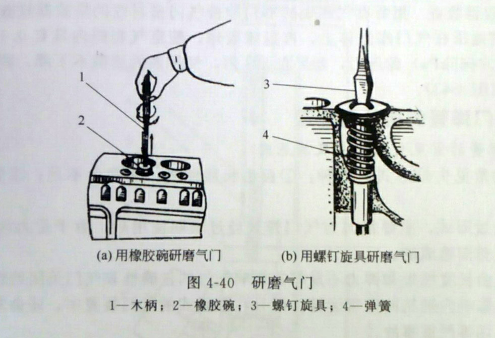 3、用橡膠碗吸住氣門頭,使柴油發(fā)電機組氣門往復旋轉進行研磨,如圖4-40(a);若沒有橡膠碗,氣門頂有凹槽的,可在氣門桿上套一根軟彈簧,用螺釘旋具進行研磨,如圖4-40(b)。