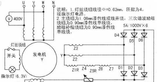 柴油發(fā)電機組實質(zhì)是臺三次諧波自勵磁凸式三相四線同步發(fā)電機,因具有輸出功率大、適合移動等優(yōu)點,故廣泛用于廠礦、工程施工等場合。雖然功率不同的發(fā)電機,其繞組數(shù)據(jù)有所不同,但電路連接基本相同。